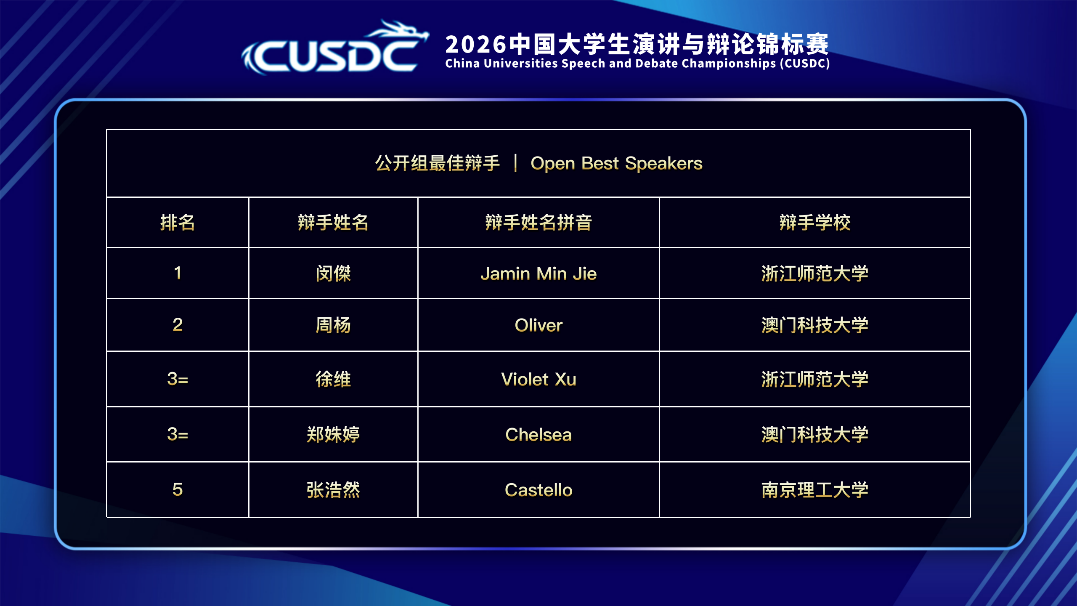 本届比赛吸引海内外顶尖高校辩论队伍队汇聚一堂,在经过循环赛、淘汰赛及总决赛三阶段角逐后,两位商学院学生以扎实的英语能力、缜密思路与稳健发挥,获颁公开组季军;他们亦在个人表现环节获得佳绩,周扬同学获得「公开组最佳辩手第二名」,郑姝婷同学亦获「公开组最佳辩手第三名」。